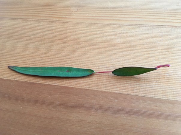 Bijzonder aan deze plant is dat de bladeren groeien uit een steeltje dat uit een ouder blad groeit. De achterkant van het blad is roodbruin met groene adertjes. En ook bijzonder is dat er twee verschillende bloemen/vruchten? uit groeien. Zie voor details de volgende foto’s.
