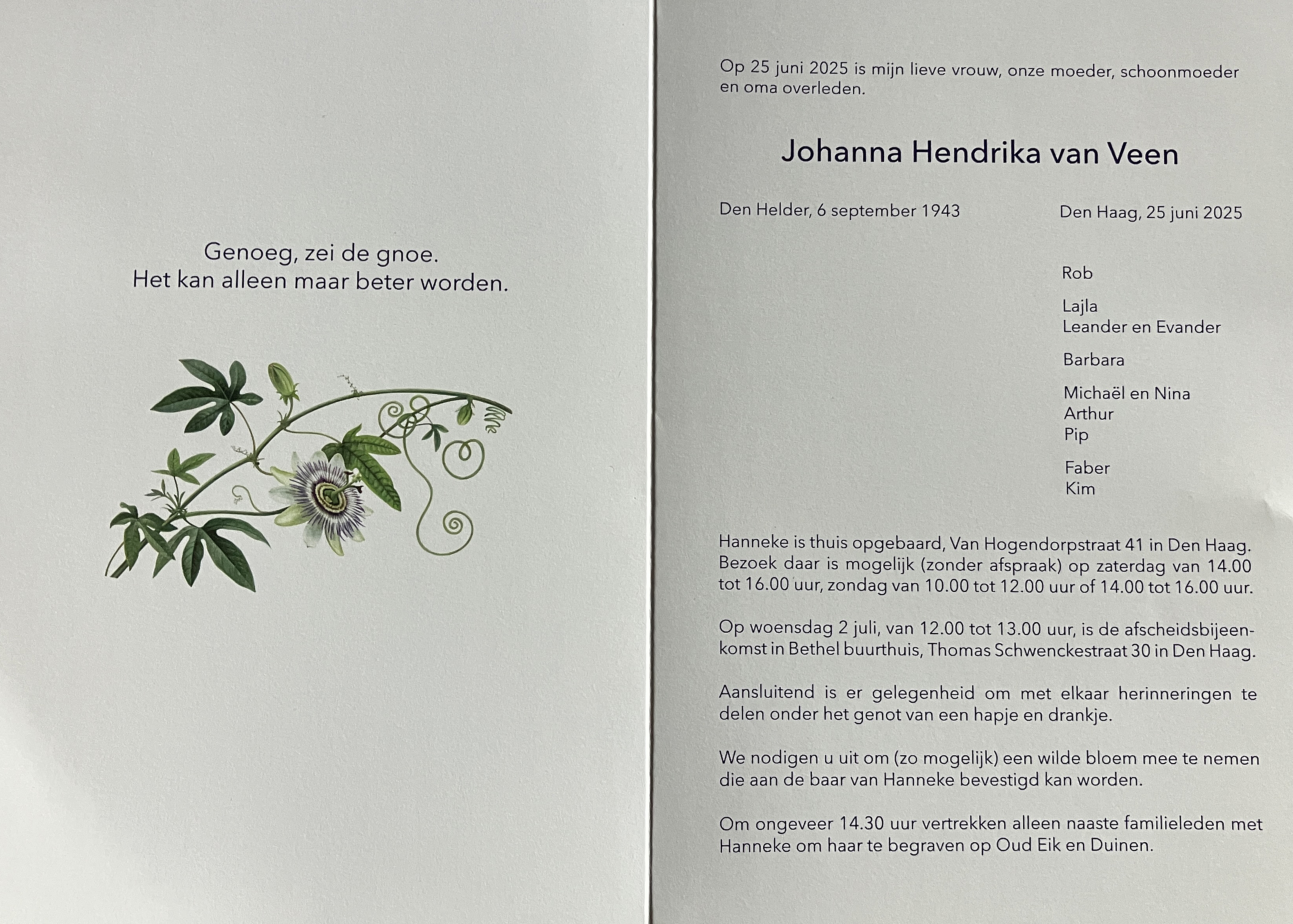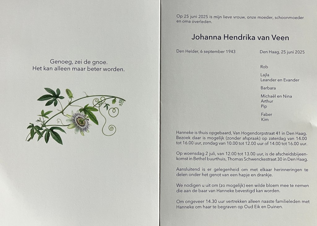 Gedeelte van de tekst uitgesproken door echtgenoot Rob van Eeden tijdens de begrafenis van Hanneke van Veen.