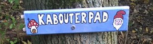 Na een groot grasveld zagen we een smal paadje dat langs een brede sloot liep. Met zo’n honderd meter verder … een verrassend bordje. Vanzelfsprekend waren we geïntrigeerd, zelf af en toe ook met kabouter(huisjes) bezig. Zoals hier en hier beschreven.
